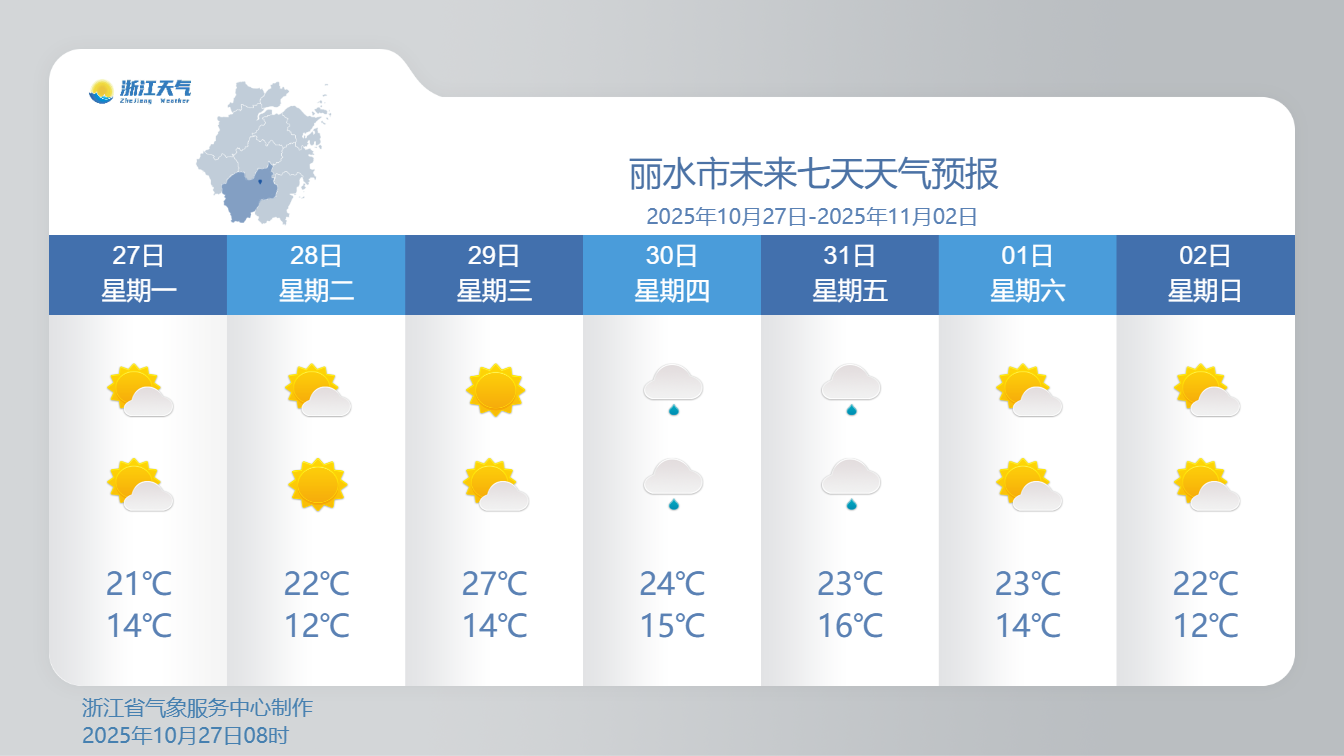 气温方面,近两天有一次小幅回温的过程,尤其到29日白天,达到本次升温高点,大部分地区最高气温能达25℃左右,像丽水预计有27℃,感觉又是短袖的节奏。